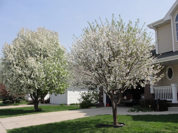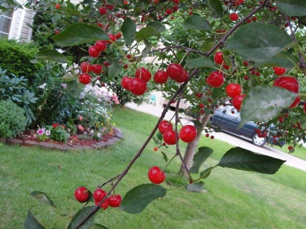 这是我们生平第一次动手种树,完全是“照书种树”,经历了第一年严冬的考验,第二年的早春,小樱桃树竟然开花了,然后自然也结了为数不多的红樱桃果子,这是我们第一次体验到了活生生的“果实”的喜悦。小树长的很快,2年后就比一人高了,照常春天开花,夏天结果,不过这果子尝起来酸酸的,比华盛顿州的bing 樱桃差远了,用来做樱桃派也许还行。然而小鸟们就好这口,樱桃刚一红,就成了小鸟们的美食,我们当然不能与小鸟们抢食,乐得站在门前看小鸟们在树上聚餐,在草地上和旁边的车道上留下斑斑点点紫红色的“纪念物”。